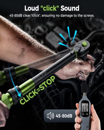 - ??¡¾???????? ?????????? ??????????¡¿This torque wrenches has been upgraded to have a louder Click sound. We conducted over 25.000 tests to ensure that each product produces a click sound volume of no less than 45dB when the torque value exceeds 34 lbf¡¤ft. When you hear the distinct click sound. it indicates that the preset torque has been reached. signaling you to stop applying force. You no longer need to worry about damaging your mechanical components.